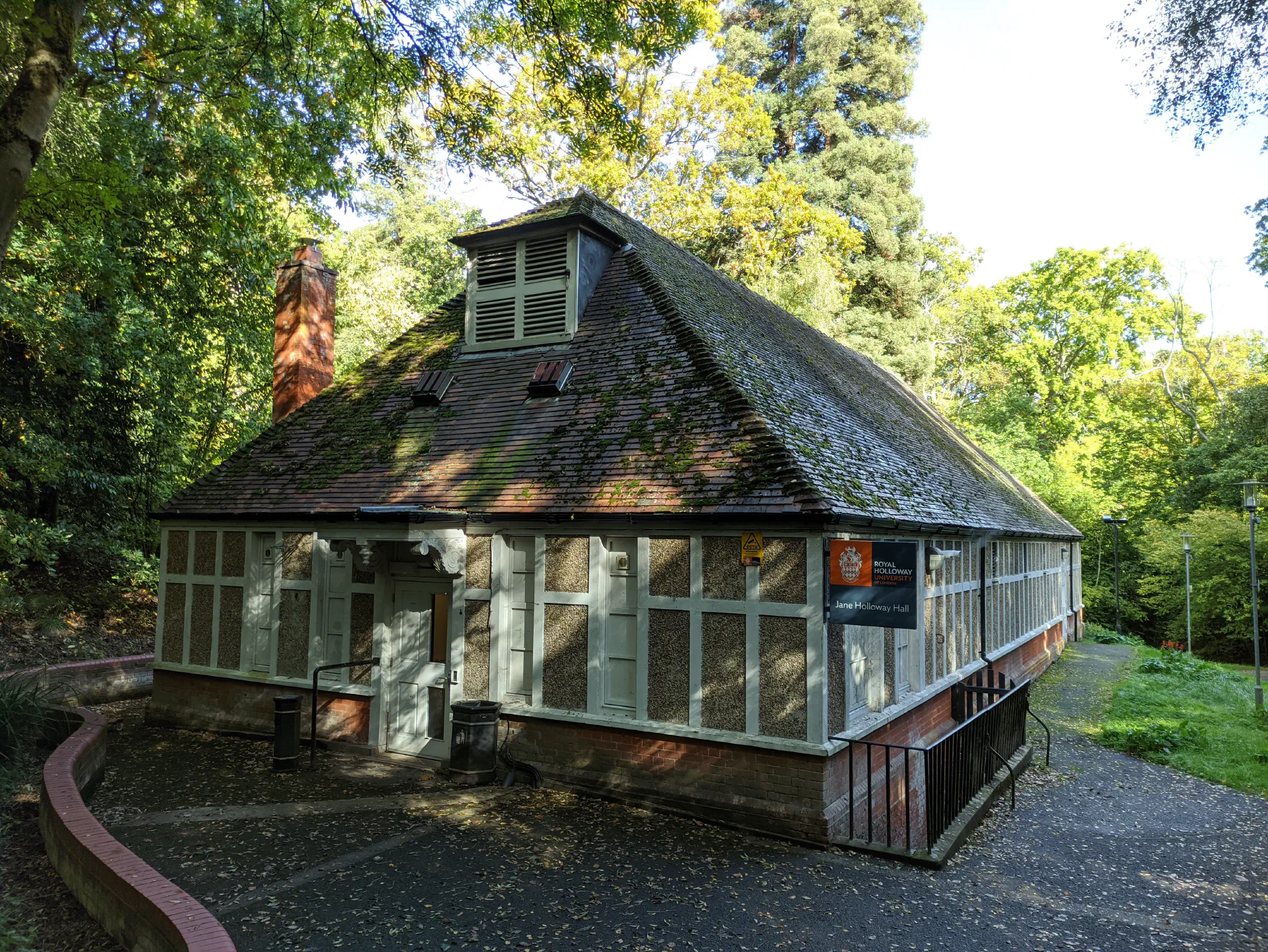 On the wooded slopes below Founder’s is the grade two listed Jane Holloway Hall, which was formerly an indoor heated swimming pool. It was built in 1893, so about a decade after Founder’s was constructed. This completion date would make it one of the earlier examples in the UK. It is not nearly as visually impressive as Founder’s, but it suits the wooded environment well. Unfortunately, they decided to pebble dash it, which I think is a bad call on any building. Fortunately, the interior has the brickwork exposed, and is notable for its “elegant pinjointed steel roof trusses” 2.